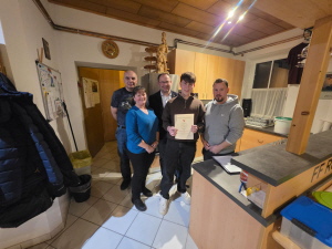Hr.Ribisch übergab der Feuerwehr eine selbstgemachten Floriani und ein Feuerwehr Wappen für den Mannschaftsraum.